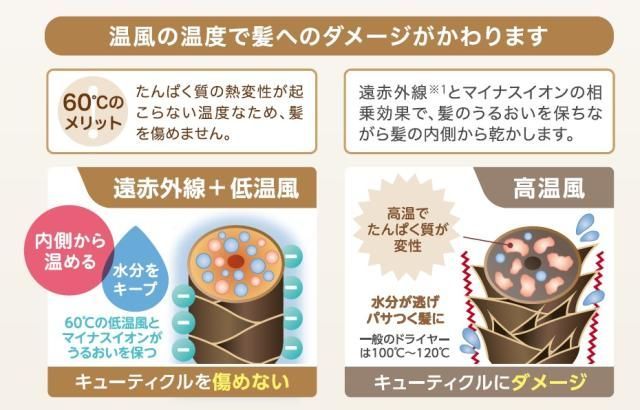 髪にやさしい低温風ドライヤーなので髪のキューティクルと頭皮へのダメージを軽減します。
