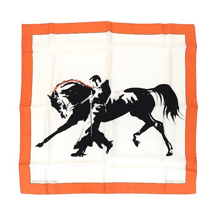 エルメス HERMES スカーフ カレ 70 シルク ZINGARO TOKYO 2005 ミニスカーフ バンダナ 正方形 馬 オレンジ ブラン ホワイト ノワール ブラック mbq 30002