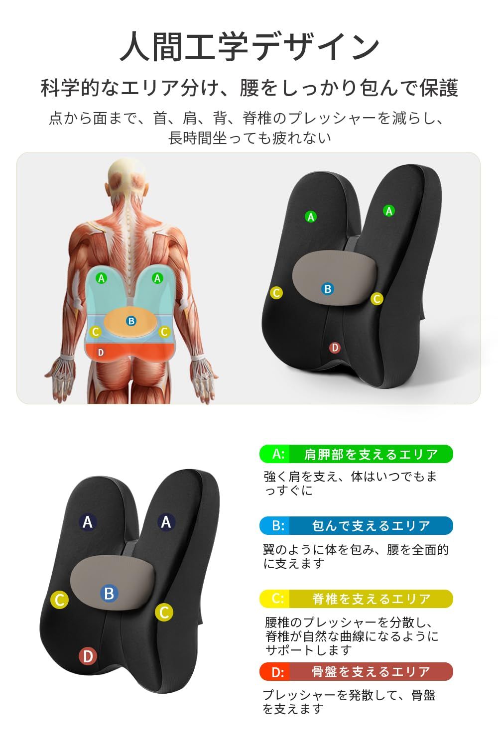 新しくアップグレードされた腰クッションと座布団の統合、座りがちな疲れない該当クッションは腰クッションと座布団の2点セット品です、腰からお尻まで体に一体化的なサポートをあげます。長時間座っていると、腰椎の損傷につながります、この腰クッションと座布団はあなたが正しい姿勢を維持するのを助けることができます、腰をしっかりと支え、腰背にフィットして自然な曲線を保ち、腰部と臀部への圧力を軽減して、身体をよりリラックスさせることができます。