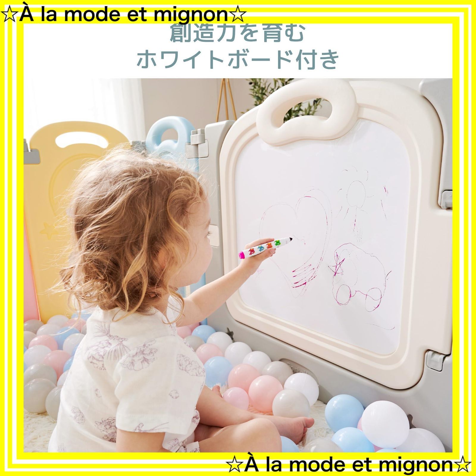 「知育玩具&お絵描き」他のベビーガードとは違い、パネルの1枚には赤ちゃんの脳の発達を促す、5種類の知育玩具を設置しております。またゲートの裏はホワイトボードになっていて、落書きも自由にできます。