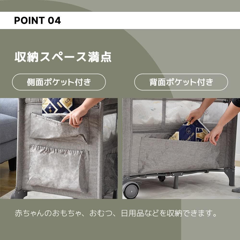 ◆ 01お部屋に馴染むオシャレなデザイン どんなお部屋にも馴染みやすいナチュラルなカラーがオシャレ,インテリア性の高いデザインにこだわりました。大きくなったらプレイヤードとしてマットを下段に取り付けると、プレイヤードになります。 ◆ 02収納に便利 たたみ方は簡単床面の中央にあるバンドをつまみ、引っ張りあげながら畳んで、収納袋に入れるこんなにコンパクト,使わない時はらくにたたんで収納できます。収納時はマットを取り出してから、たたんでください。詳しいたたみ方については取扱説明書をご参照ください。 ◆ 03どこでも気軽に設置できて 移動や持ち運びも便利下部にキャスターが付いているので、お家の中での移動がラクラク持ち上がると移動し、置くと止まり、安全で移動しやすい ◆ 04収納スペース満点 側面バック付き背面バック付き赤ちゃんのおもちゃ、おむつ、日用品などを収納できます。 ◆ 05簡単組み立 ツールは不要で、3分であっさりと組み立て完了。お昼寝シートはファスナーで取り外し可能、さらにプレイヤードモードに簡単チェンジ。赤ちゃんの安全を守るために、後退防止の特別ファスナーを採用していますので、ファスナーをあげる時は真っすぐではなく、すこし上がってあげてください。