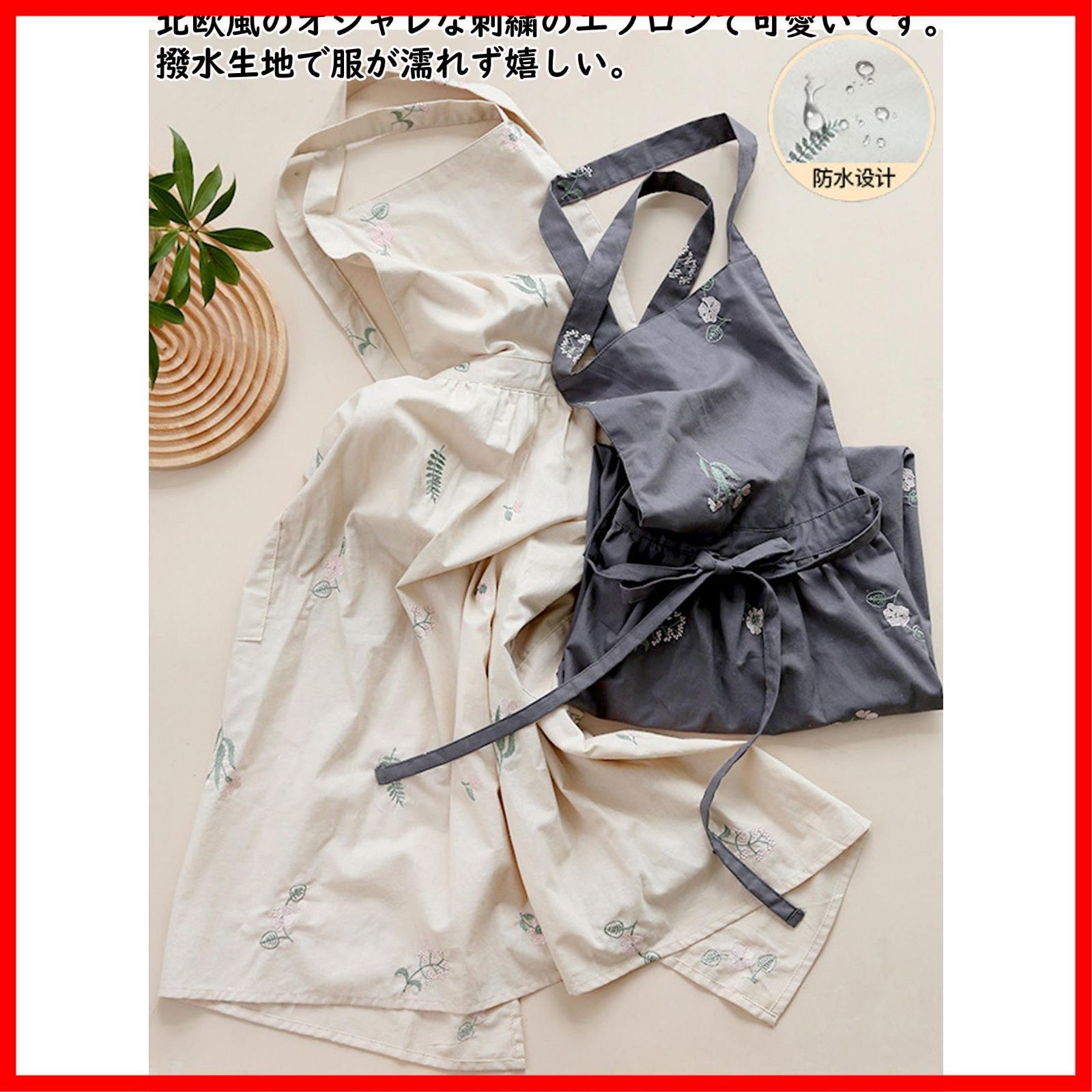 【使いやすい】オシャレなエプロン、後ろで交差して着るスタイル、ポケットが両サイドにあるので便利。ポケット付きでウエスト部分の紐にタオルもはさめて便利。前で結ぶのは便利で良かったです。たっぷりした生地で刺繍もデザインも素敵で白のコーデは気分も明るく楽しくなりますね!刺繍が可愛くて子供も褒めてくれ、キッチンワークが楽しくなります。