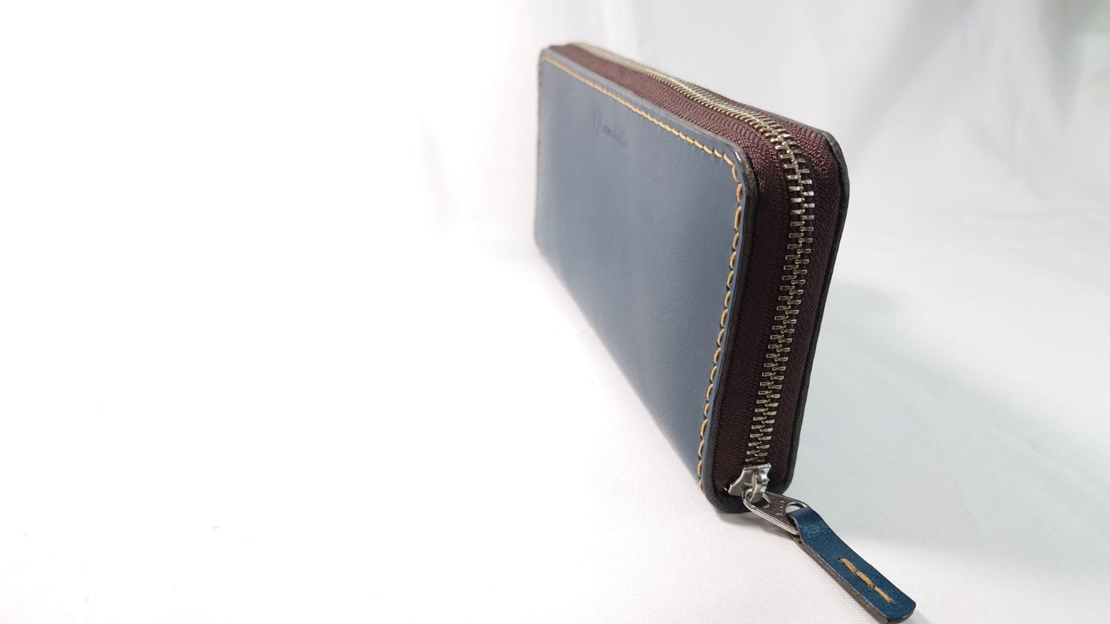 革裁ちから縫製まで全て手作業で製作している一点物ラウンドウォレットになります