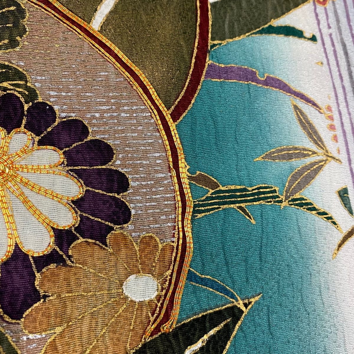 右前袖付けと右後袖付けに縫い目のゆるみ、表地所々に金彩の変色、上前に金糸のヨレがございます。