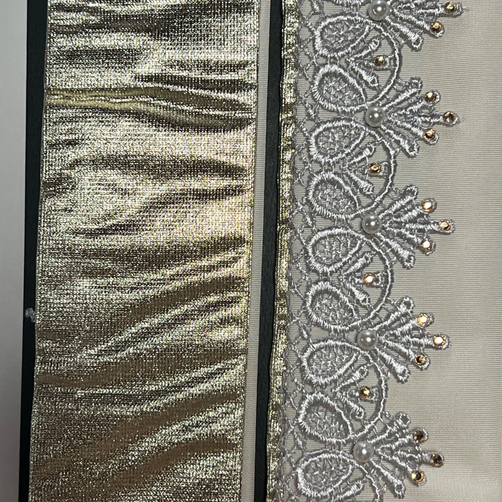 白地にシルバーのレース・パール・ラインストーンが施された伊達衿です。裏は金になっています。