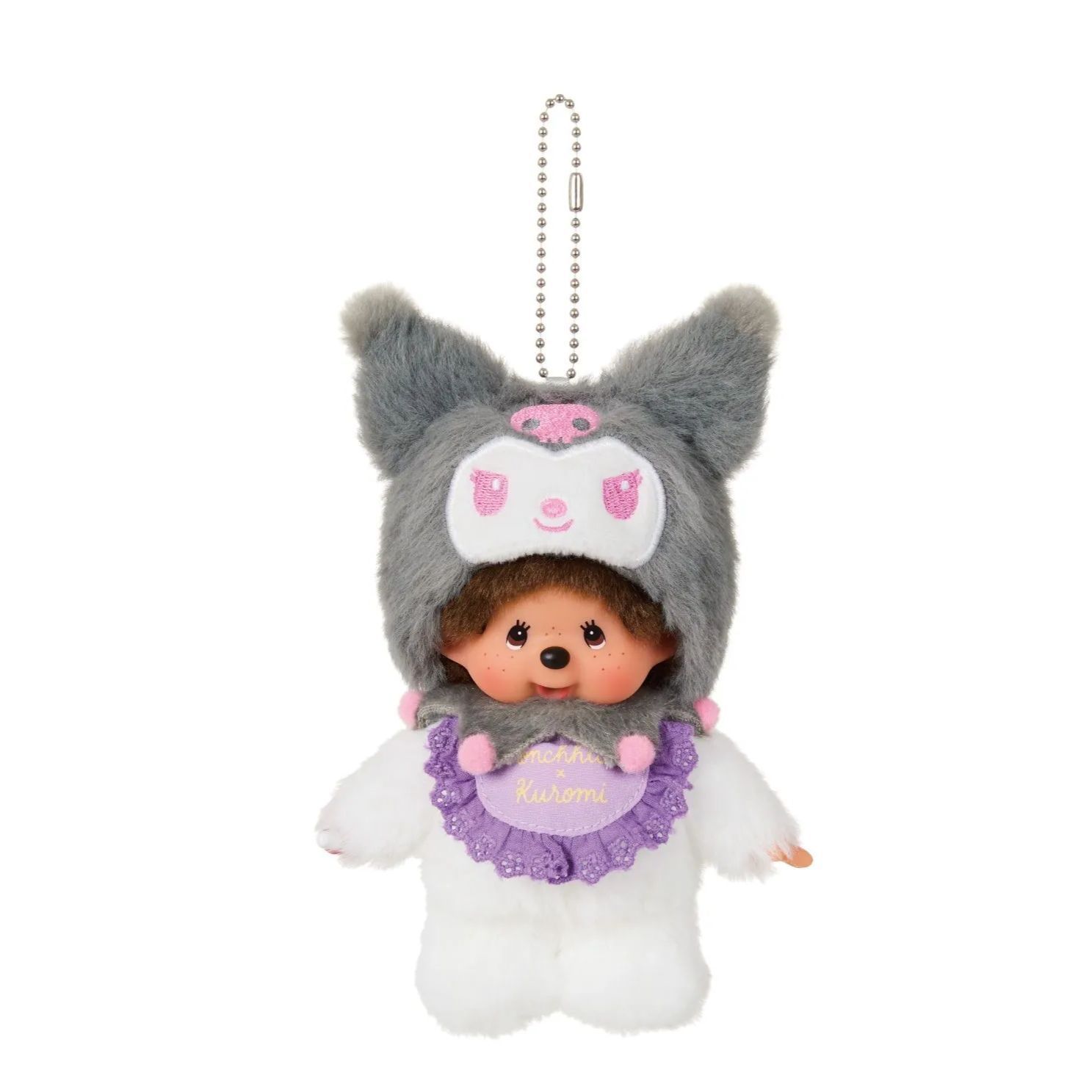 キーチェーンサイズのモンチッチです。 手触りの柔らかいボアを採用しており、フードは着脱不可です。 フードのお顔は刺繍で、スタイはプリント仕様です。