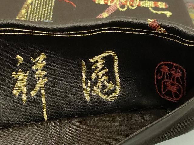 平和屋着物 上 田中工芸織物 祥園謹製 つけ帯 唐織 楽器花文 赤墨色地 金糸 三越扱い kh 5