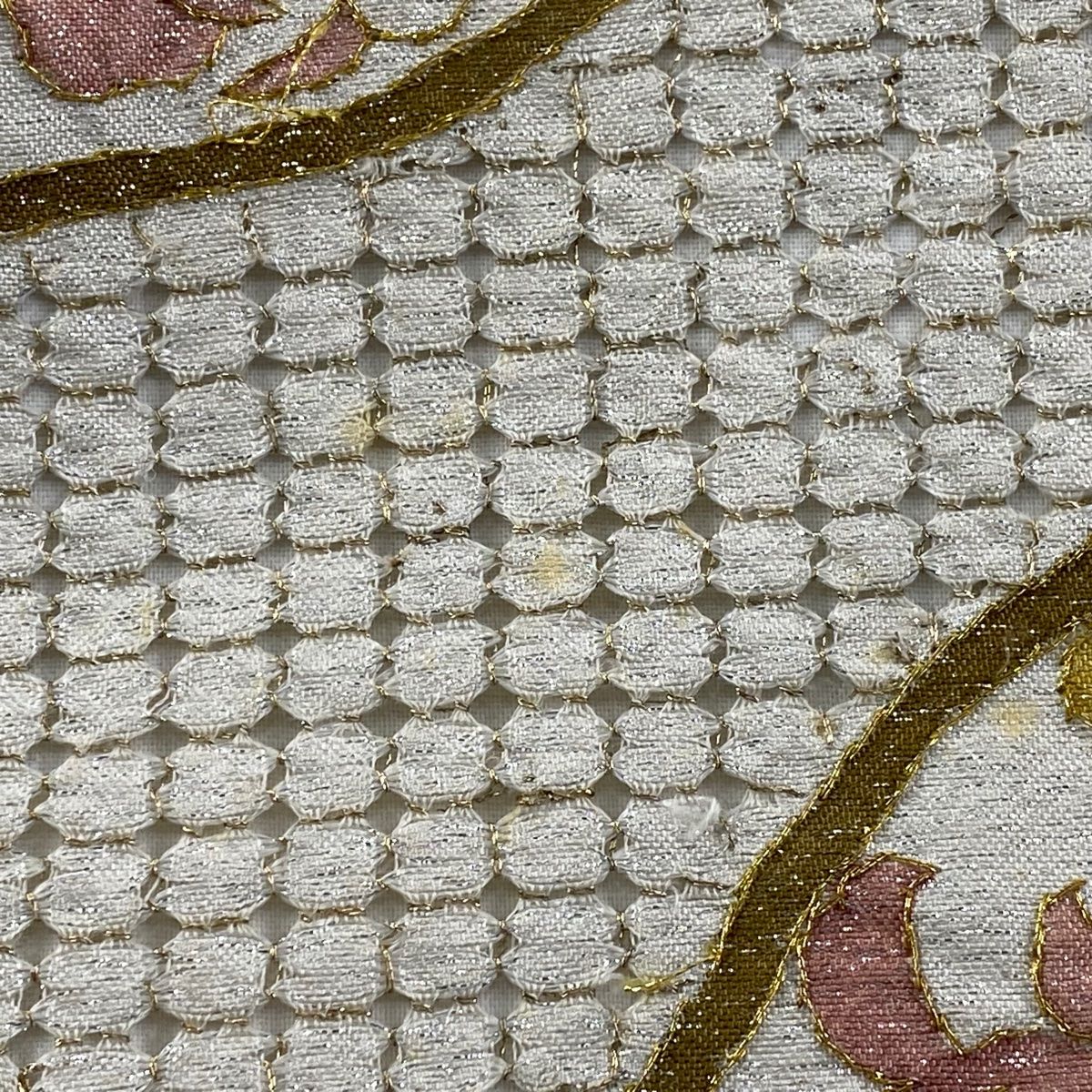 袋帯 華文 向かい鳥 螺鈿 箔 ベージュ 六通 正絹