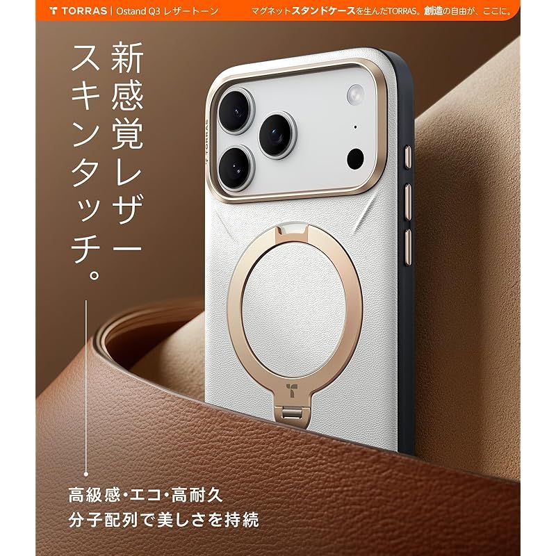 TORRAS iPhone 17 Pro 用 ケース 新感覚レザー スキンタッチ Ostand Q 3 レザートーン MagSafe対応 リング スタンド 360°定点回転 縦横両対応 マグネット搭載 革 カメラコントロールボタン 米軍規格 耐衝撃 指紋防止 パ
