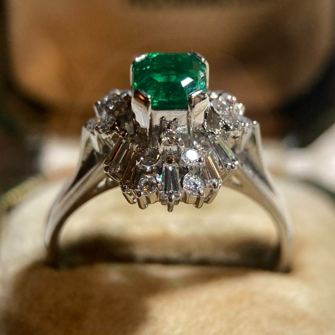 pt 900陽刻 コロンビア産 GIA F 1 エメラルド0.98 ct × ダイヤモンド ヴィンテージリング 指輪|GIA鑑別書付き