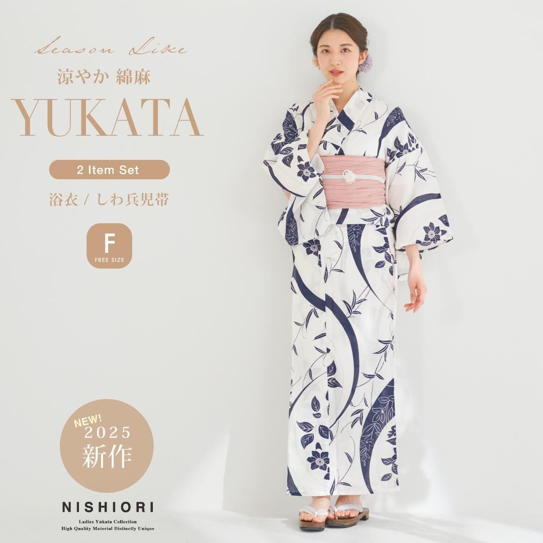 綿麻 浴衣 帯付き 2点セット 白 紺 フリーサイズ レディース No.7