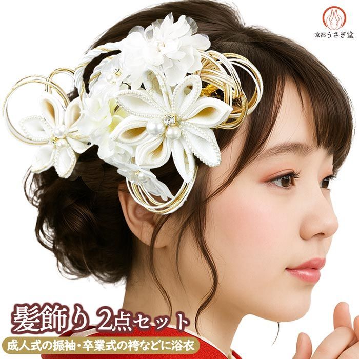 振袖用 髪飾り 2点セット wk-338 つまみ細工 花飾り 花かんざし ヘア ホワイト 白 パール 水引 房飾り 成人式 振袖 浴衣 七五三 卒業式 結婚式 パーティー 県 は 京都うさぎ堂