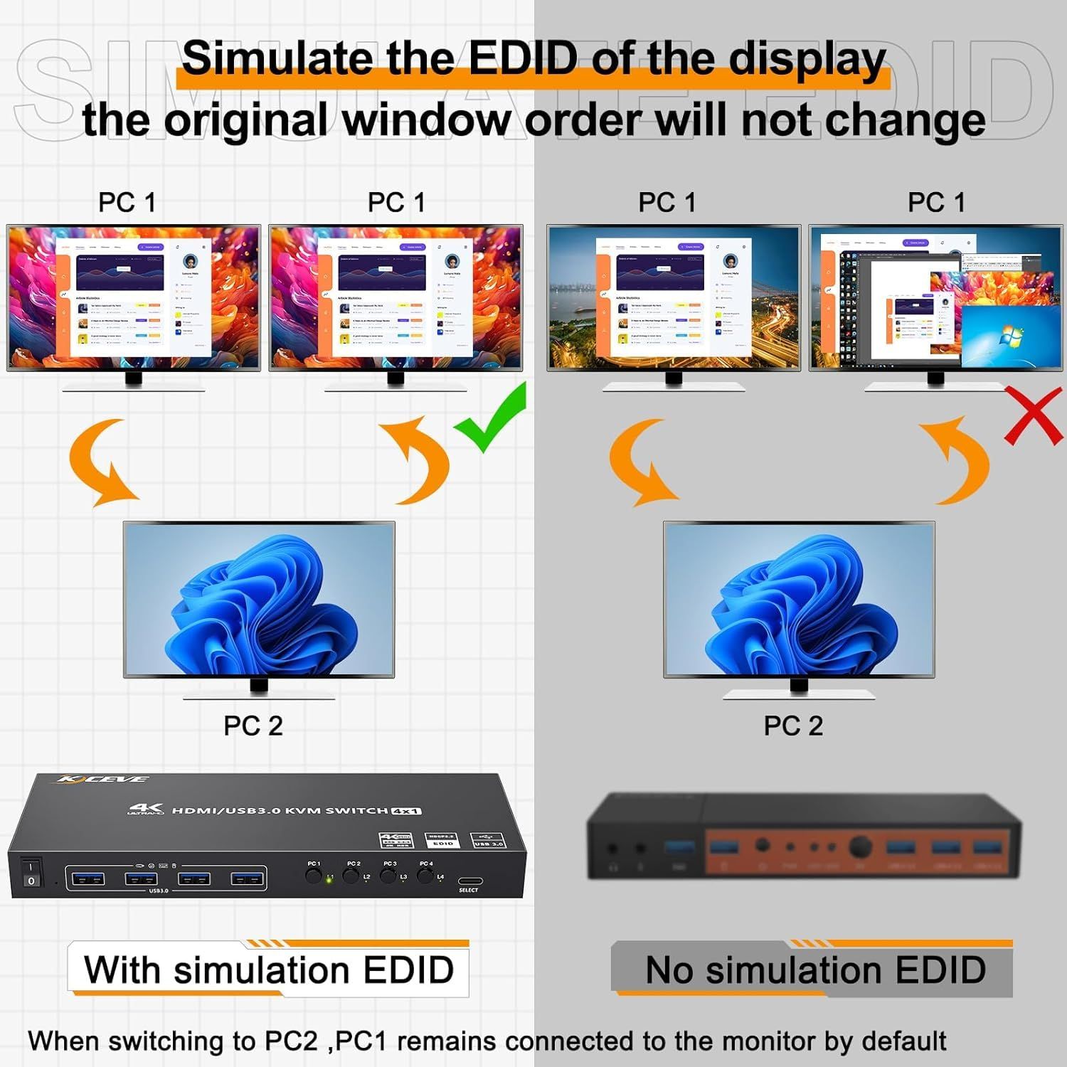 KCEVE HDMI USB 3.0 KVMスイッチ 4入力1出力 PC切替器 4 K 60 Hz EDID保持 4つUSB 3.0ハブ備えた USB切替器 ワイヤレスキーボード マウスをサポート ドライバ不要 手元スイッチ付き