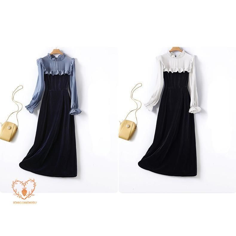 感溢れるベルベット素材のロング丈ワンピース レディース 長袖 フリル入り 着痩せ 春 秋 冬 マキシ丈 切り替えデザイン 柔らかい 上質