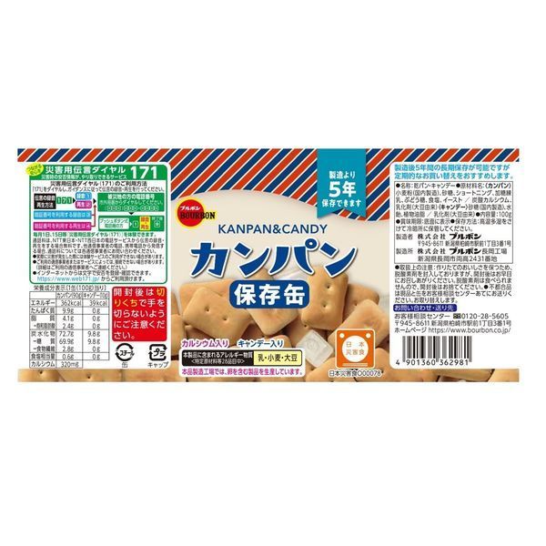 ・原材料:<カンパン>小麦粉(国内製造)、砂糖、ショートニング、加糖練乳、ぶどう糖、食塩、イースト/炭酸カルシウム、乳化剤(大豆由来) <キャンデー>砂糖(国内製造)、水飴、植物油脂/乳化剤(大豆由来)