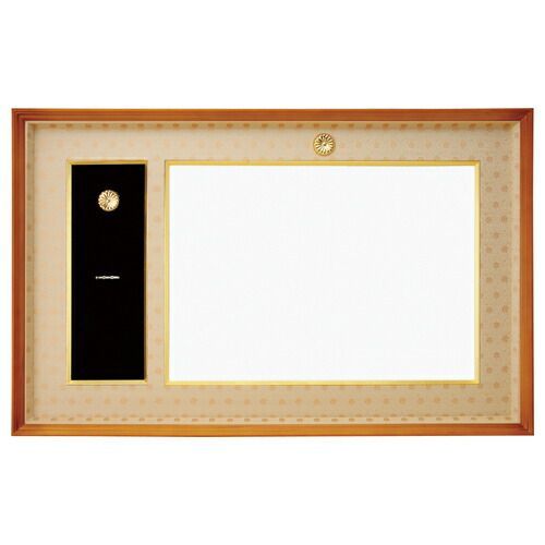 ●外寸:縦620×横980mm●フレーム厚:55mm●収容可能サイズ:賞状(勲記)部分=縦420×横595×厚1mm,勲章部分=縦420×横148×厚16mm●重量:約9kg●材質:サクラ材●吊りひも,吊り金具付