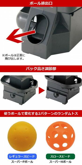 2つの速さの違うボールをランダム排出。5秒間隔で最大21球まで連続正面トスします。41mmボールで効果的な芯打ちと、カラーによる打ち分けトレーニングを実現します。 生産国:中国 素材・材質:本体:ABS強化樹脂ボール:PE(ハードプラスチック) 商品サイズ:W18×H24×D24cm 重量:約850g(電池含まず) 仕様:使用電池:単2電池×4本(別売)トス飛球距離:3~4mトス間隔:5秒取扱説明書:パッケージに記載 セット内容:本体、スーパーPボール×6個(3色各2個)、スーパーHボール×6個(3色各2個)