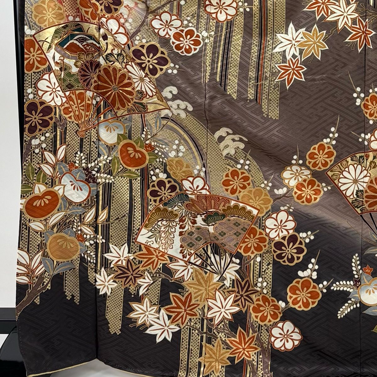 振袖 身丈170 cm 裄丈65 M 袷 扇 枝梅 金糸 金彩 茜色 正絹 秀品