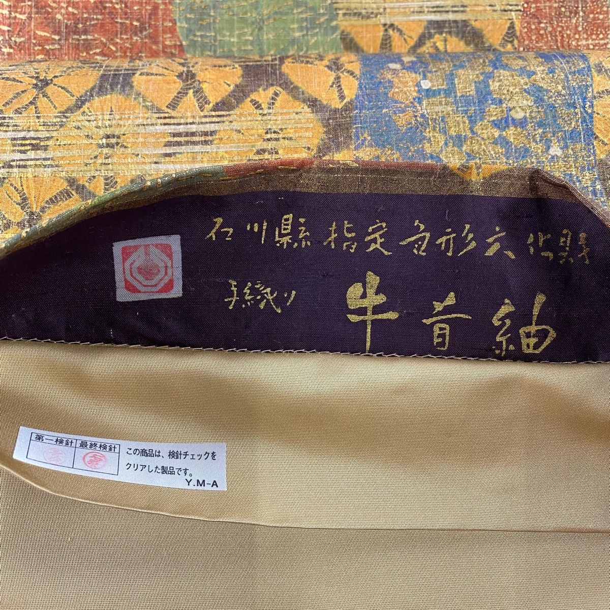 袋帯 落款 証紙 牛首紬地 霞 幾何学 金銀彩 絞り 黄土色 全通 正絹