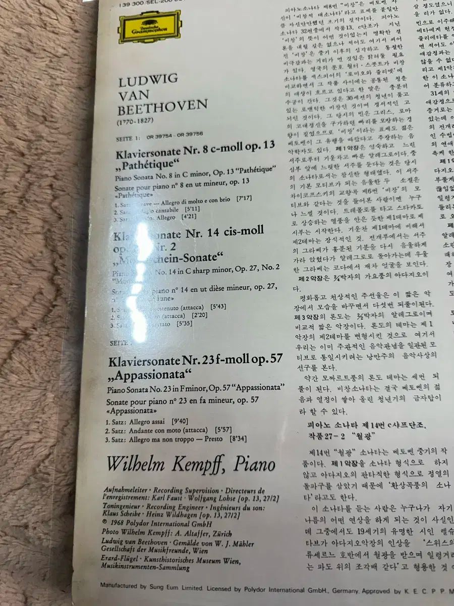 • 特徴: ピアノの巨匠ヴィルヘルム・ケンプが演奏するベートーヴェンピアノソナタの中で最高傑作である **「悲愴」、「月光」、「熱情」** を収録したドイツ・グラモフォン(DGG) 名盤です。クラシックLPコレクターなら必須所蔵すべきレコードです。