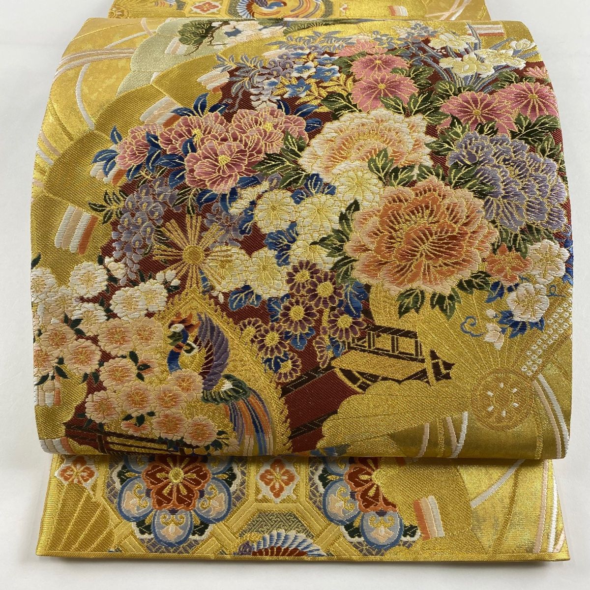 袋帯 秀品 関西仕立て 桃山秀花桧扇文 金糸 箔 金色 六通 正絹