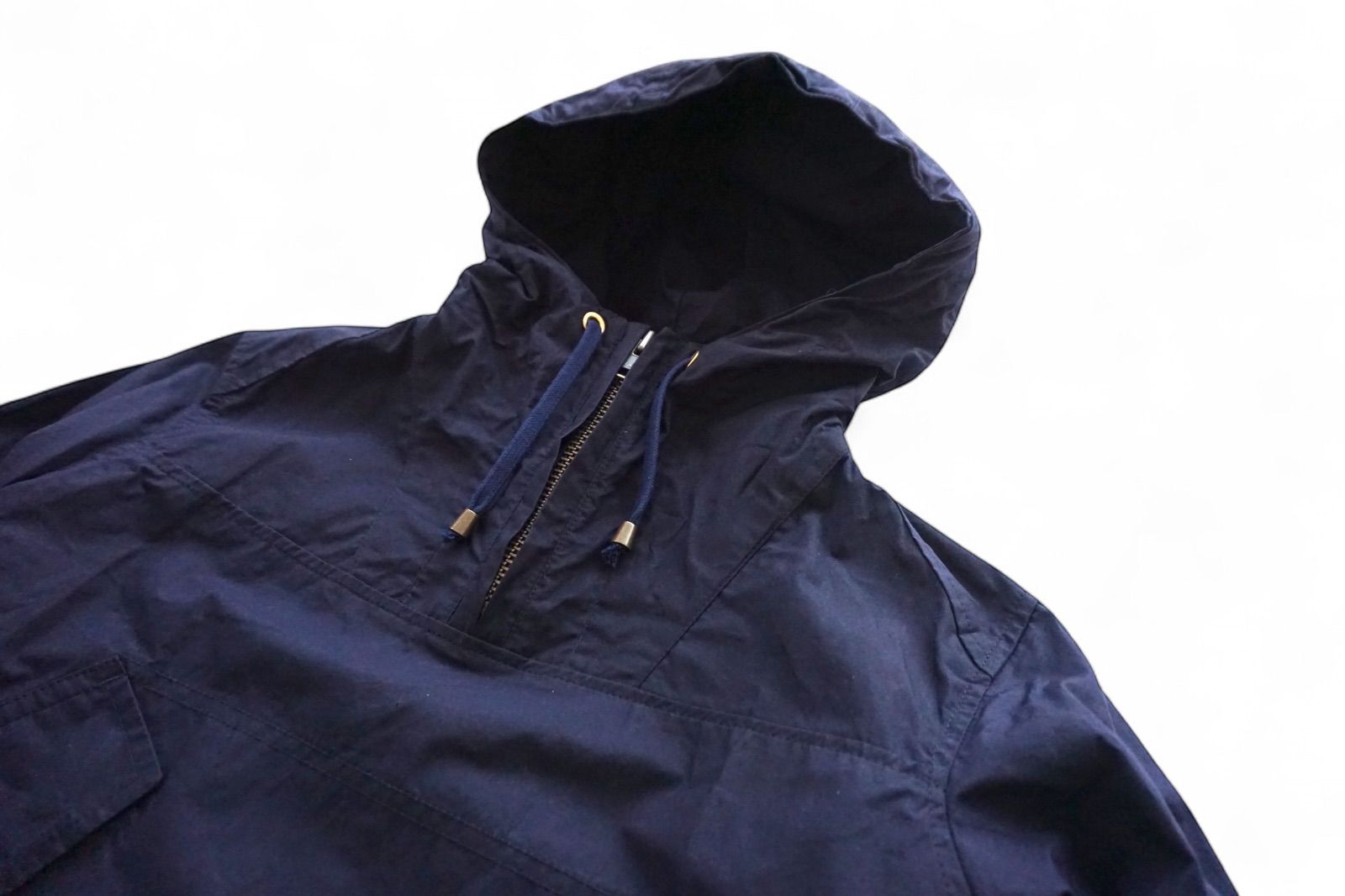 英国で最も古いワックスクロスミルの1つによって生産された乳化ワックス仕上げクロスを使用しています。Barbour バブアーの様な匂いや表面のオイル感は一切無く、軽量で通気性、耐候性があります。しかしながら独特の風合いがあり経年変化も楽しめる生地です。ざっくりゆったりとしたシルエットでがばっとかぶってゆったり着るとかっこいいです。昔ながらのブリティッシュ・ワークウェアを忠実に再現しながらクロスやアンティークジッパー、ドローコードなど考えられた機能性に現代的な感性を加味した英国ワークのプライドが垣間見えるアノラックパーカーです。