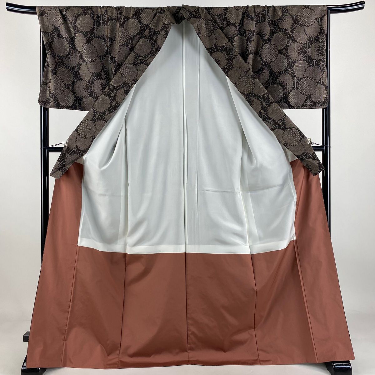 大島紬 身丈172 cm 裄丈69 L 袷 純泥染 証紙 雪輪 麻の葉 焦茶色 正絹