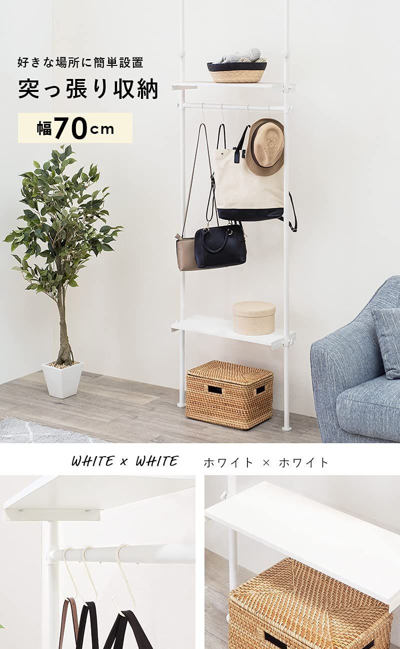 萩原 ハンガーラック コートハンガー 突っ張りラック つっぱり棚 水 汚れに強いメラミンシート棚 幅70 隙間 スリム 無段階調節 ホワイトウォッシュ KTR-3151 SW