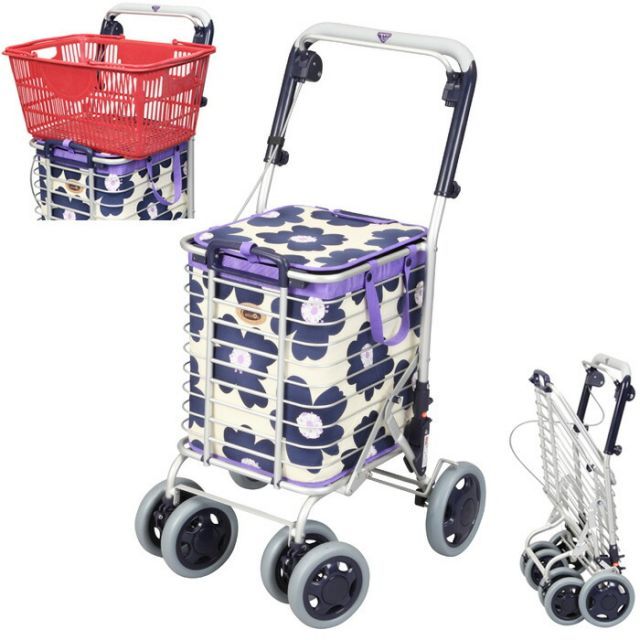 シルバーカー 手押し車 ブレーキ付きアルミワイヤーカー A-0245H 花柄青 ユーバ産業 袋付き 折り畳み式
