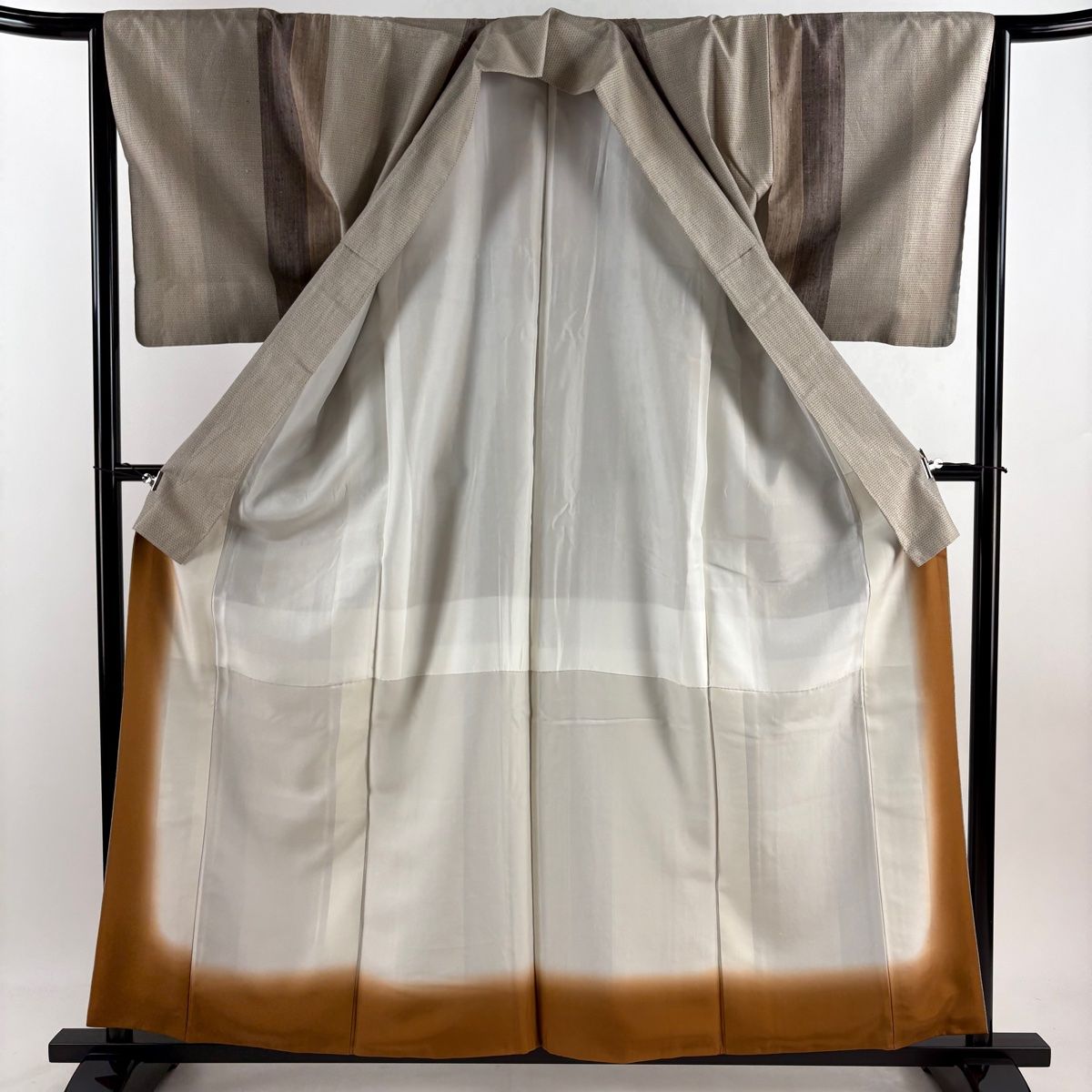 紬 身丈158.5 cm 裄丈65 M 袷 亀甲絣 縞 灰茶 正絹 秀品