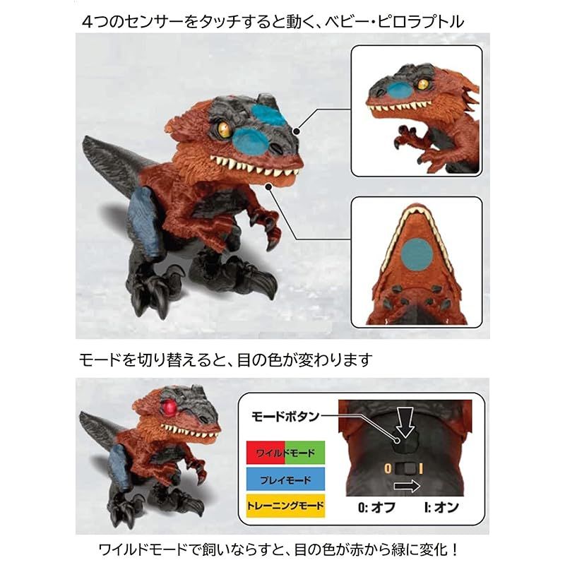 【内容】センサーに反応して動くピロラプトルのインタラクティブトイが登場!ワイルドモード、プレイモード、トレーニングモードの3つのモードがあり、目の色や反応が変わります。