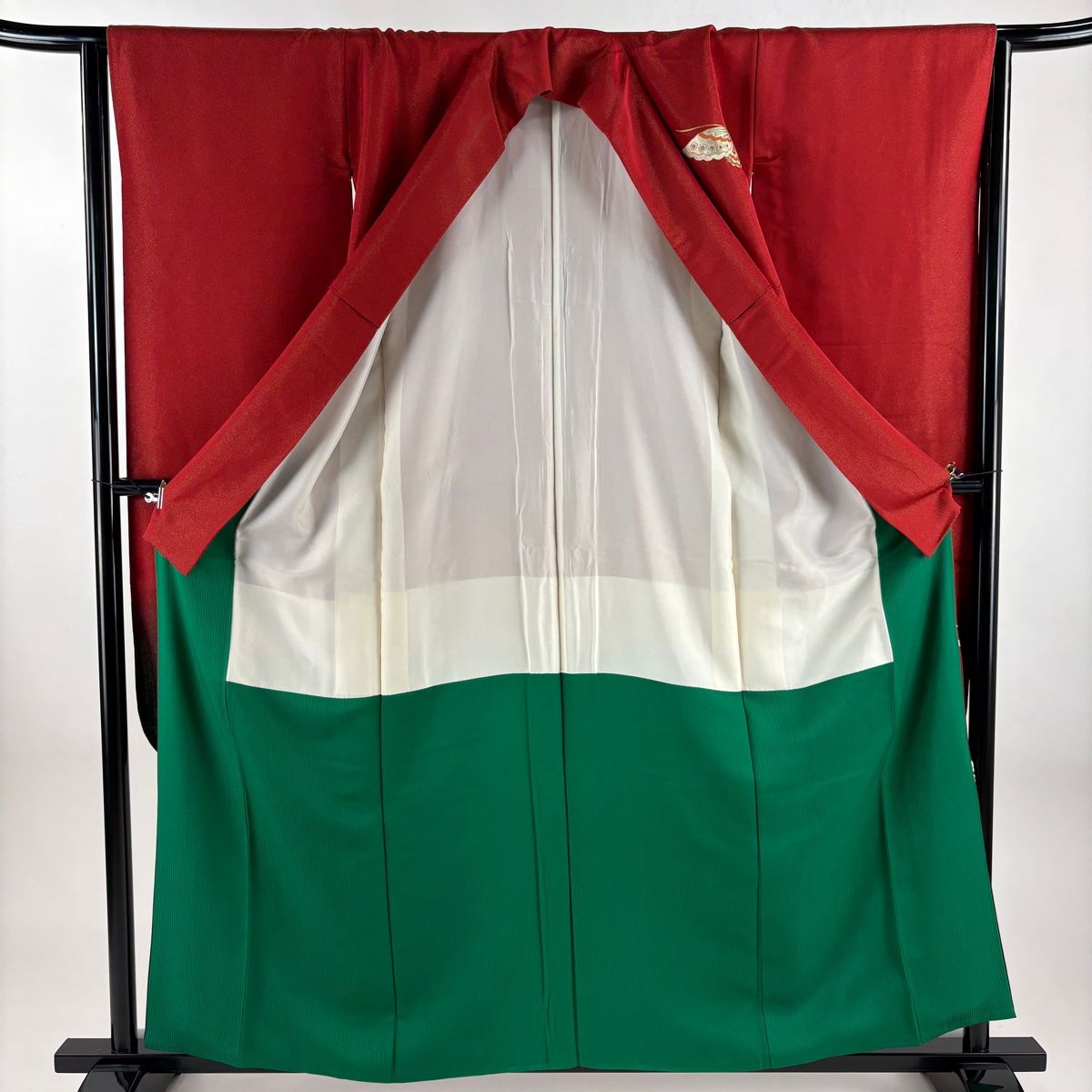 衿周りや両袖口中に汚れ、表地所々に金銀彩の剥がれがございます。