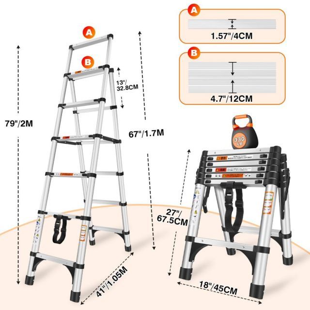 【高さ調節可能】脚立全長:1.7m+2.0m、収納時尺寸(約):幅47cm×奥行き13cm×高さ69cm階段数量:6段+7段。ステップにはそれぞれ独立したロックを配置しており、様々な高さのニーズに合わせて、自由に調整することができます、さまざまな場面に応用できます。