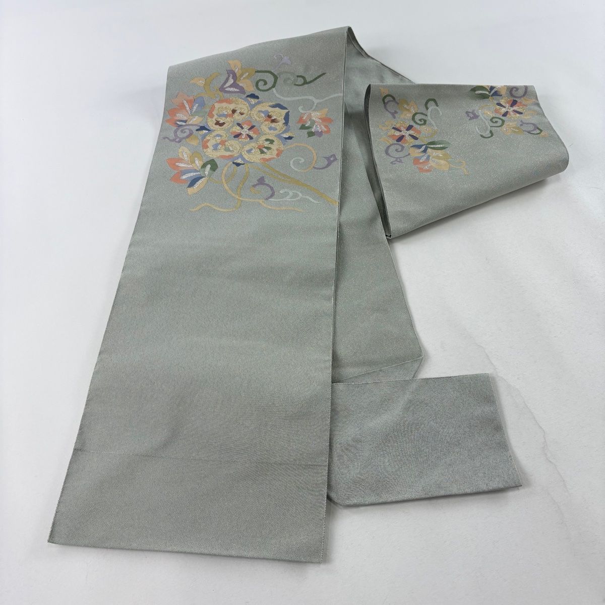 名古屋帯 秀品 八寸名古屋帯 松葉仕立て トンネル仕立て 花唐草 華文 金銀糸 灰緑 正絹