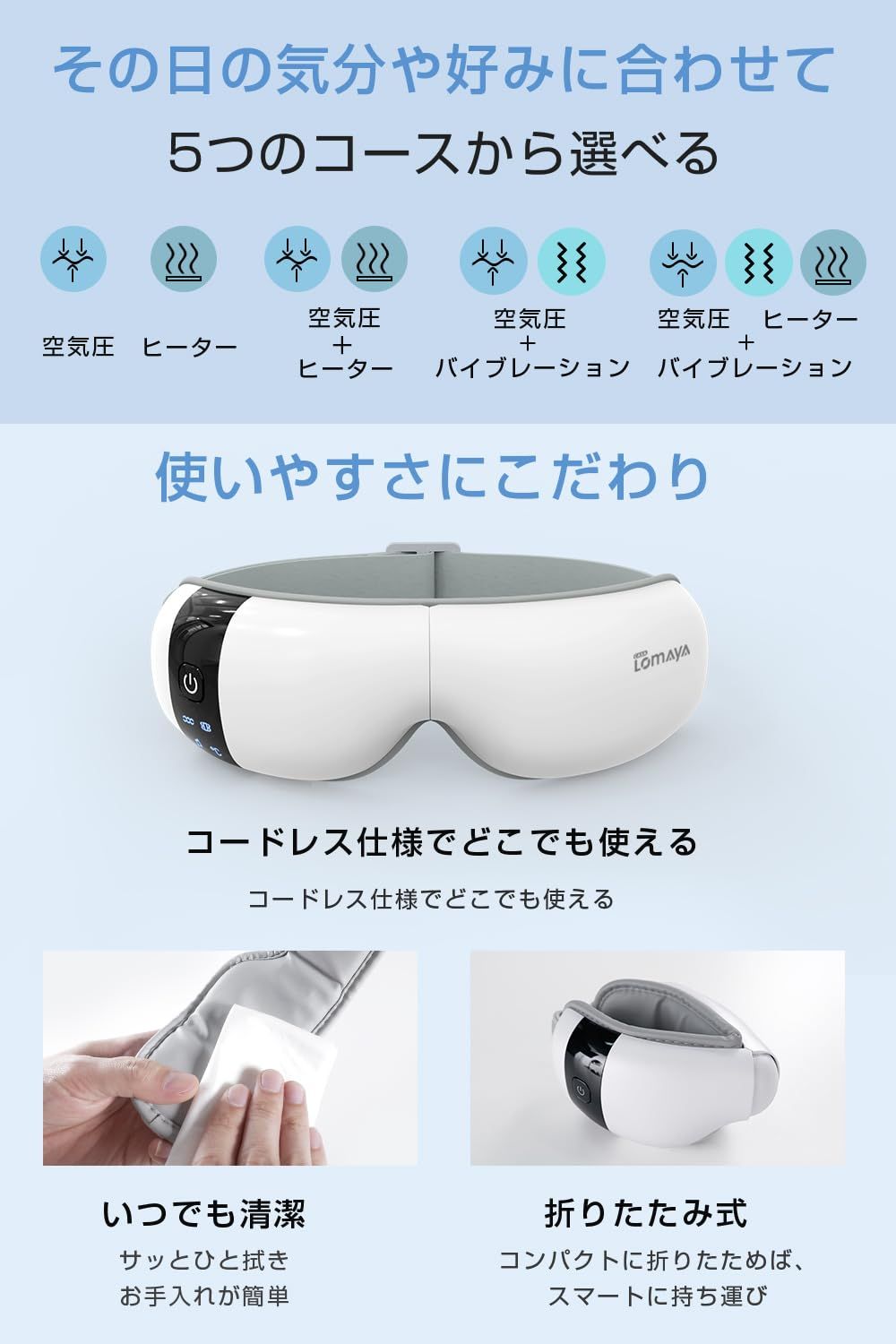 【操作簡単&プレゼントにもおすすめ】気分や好みに合ったコースを選べる5つモード搭載!また、ワンボタン設計採用、だれでも簡単に使えます。長さを調節でき、頭のサイズを問わず、ぴったりフィット!衛生面にも配慮し、肌に接触する面はプロテインレザーを使用し、拭き取るだけで清潔を保てる。家族みんなでシェアして使える充電式アイマスクです。毎日頑張る自分や大切な人へのプレゼントとしてもおすすめです。父の日のギフト 、 母の日のプレゼント にも 、 誕生日プレゼント などにもピッタリです。