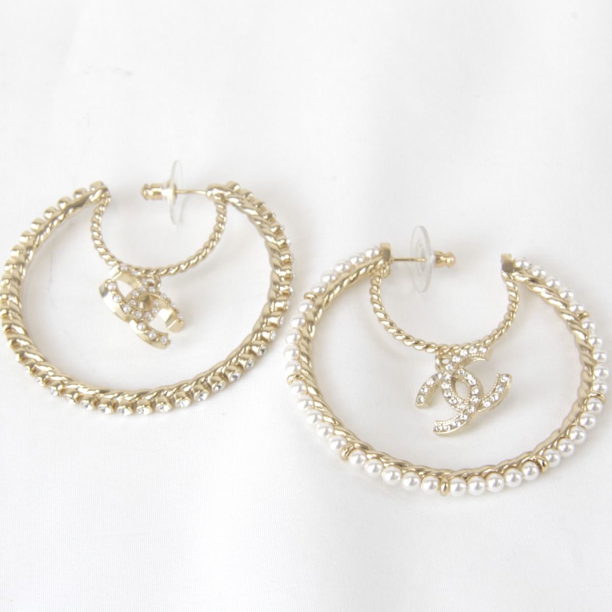 メタル CHANEL パール ラインストーン フープピアス 箱有 ピアス ゴールド