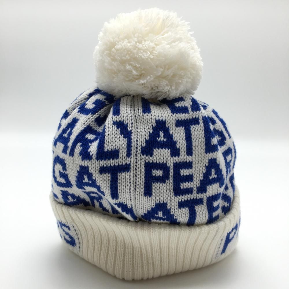 パーリーゲイツ つば付ニット帽 白×ブルー ロゴ総柄 ボンボン付 FR ゴルフウェア モデル PEARLY GATES