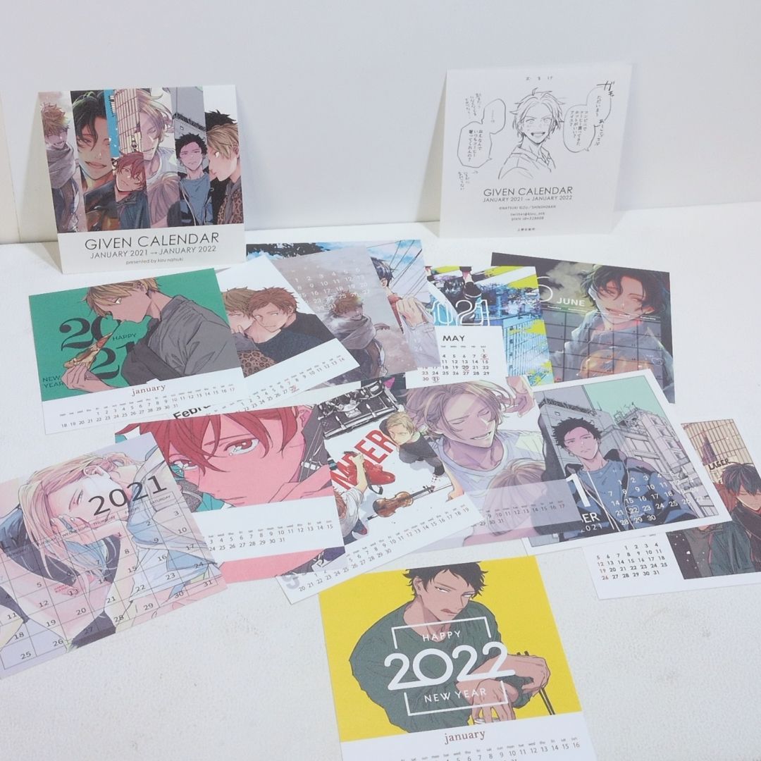 3枚の描き下ろしイラストを含んだギヴンのカレンダー立夏×真冬、秋彦×春樹、雨月のを描き下ろし他、各キャラクターの誕生日を記載。奥付におまけ1コマ漫画秋春があります。